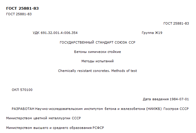 •ГОСТ 25881 БЕТОНЫ ХИМИЧЕСКИ СТОЙКИЕ. МЕТОДЫ ИСПЫТАНИЙ